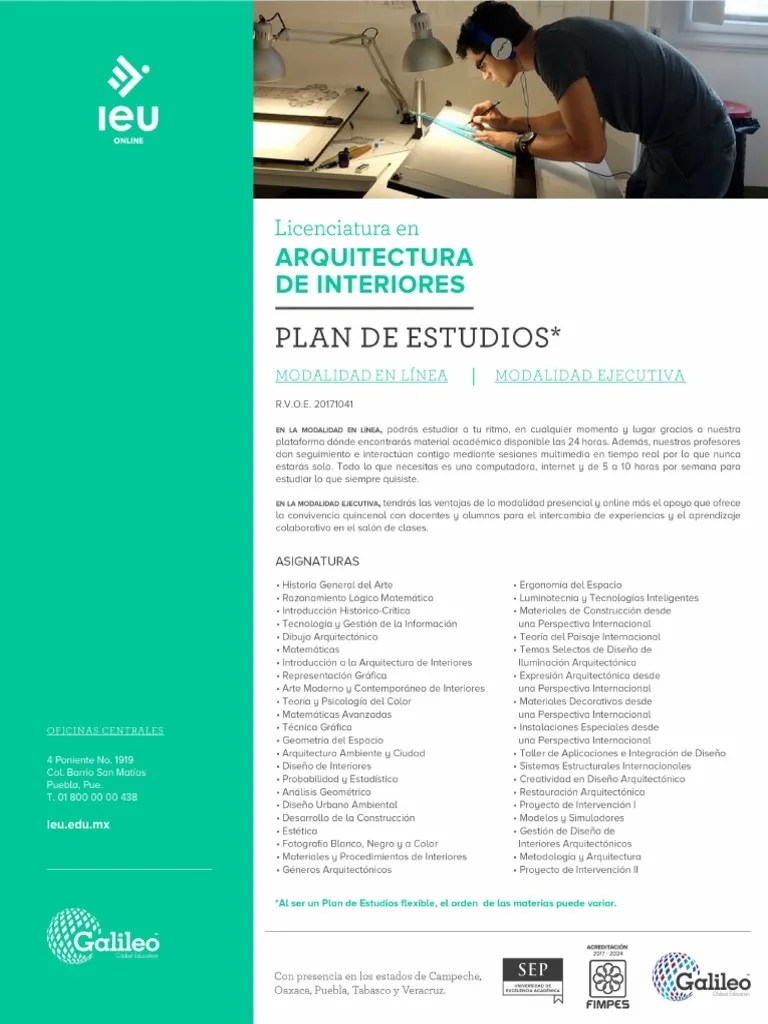 Somos reconocidos por nuestra excelencia en el diseño, la innovación y el liderazgo en construcción sostenible... Asesorías de diseño interior, proyectos de interiorismo mediante el desarrollo de procesos creativos y aplicación de técnicas como planos, moodboards y renders. Esta licenciatura en arquitectura de interiores está dirigida a todo estudiante de las áreas artísticas y sociales, graduados de bachillerato con interés en iniciar su camino profesional en el área de diseño de interiores, así como en trabajos relacionados con la funcionalidad de espacios públicos o privados. Estudia la licenciatura en arquitectura de. Además, al cursar la licenciatura en arquitectura de interiores aprenderás de estilos, instalaciones, sistemas estructurales y expresión arquitectónica desde una perspectiva internacional, lo que te dará un amplio dominio de las técnicas y tecnologías actuales para potenciar tu desarrollo profesional. Además, al cursar la licenciatura en arquitectura de interiores aprenderás de estilos, instalaciones, sistemas estructurales y expresión arquitectónica desde una perspectiva internacional, lo que te dará un amplio dominio de las técnicas y tecnologías actuales para potenciar tu desarrollo profesional.